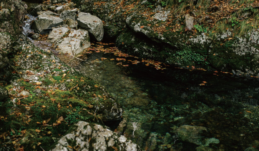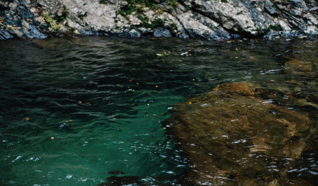 川にはアマゴが泳ぎ、水のきれいさを象徴しています。