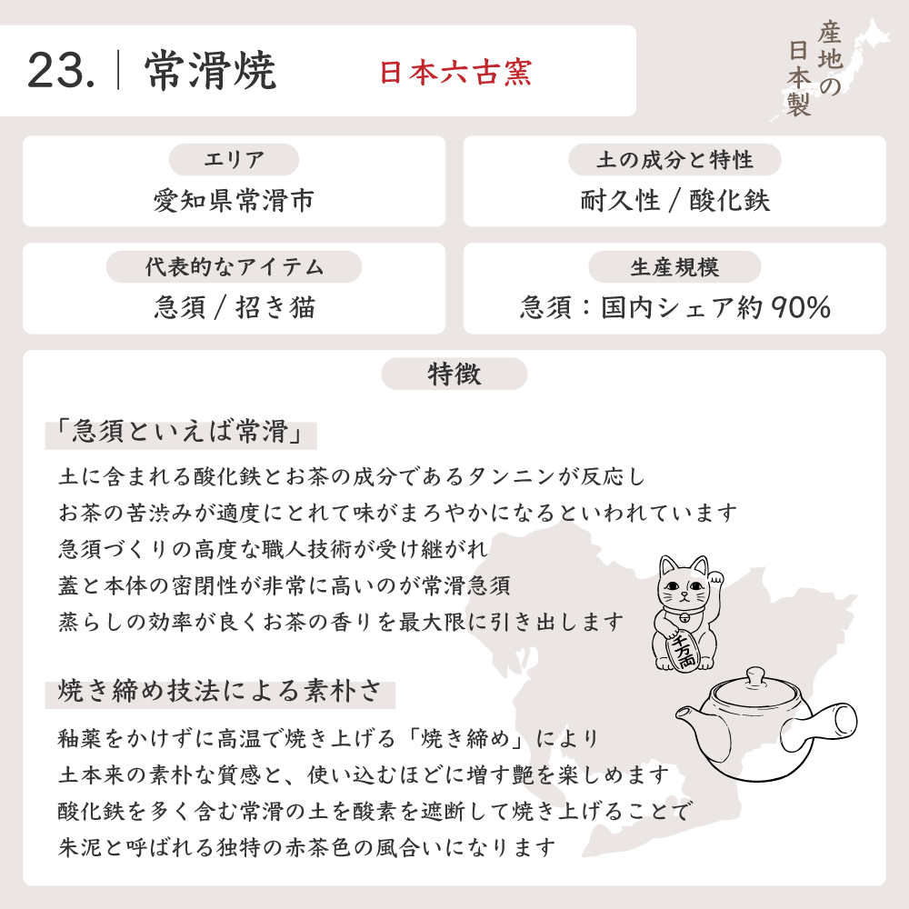 常滑焼は急須の原型となった焼物産地としても知られており、注ぎやすい口の形や持ち手は常滑焼がもとになっているとされています。