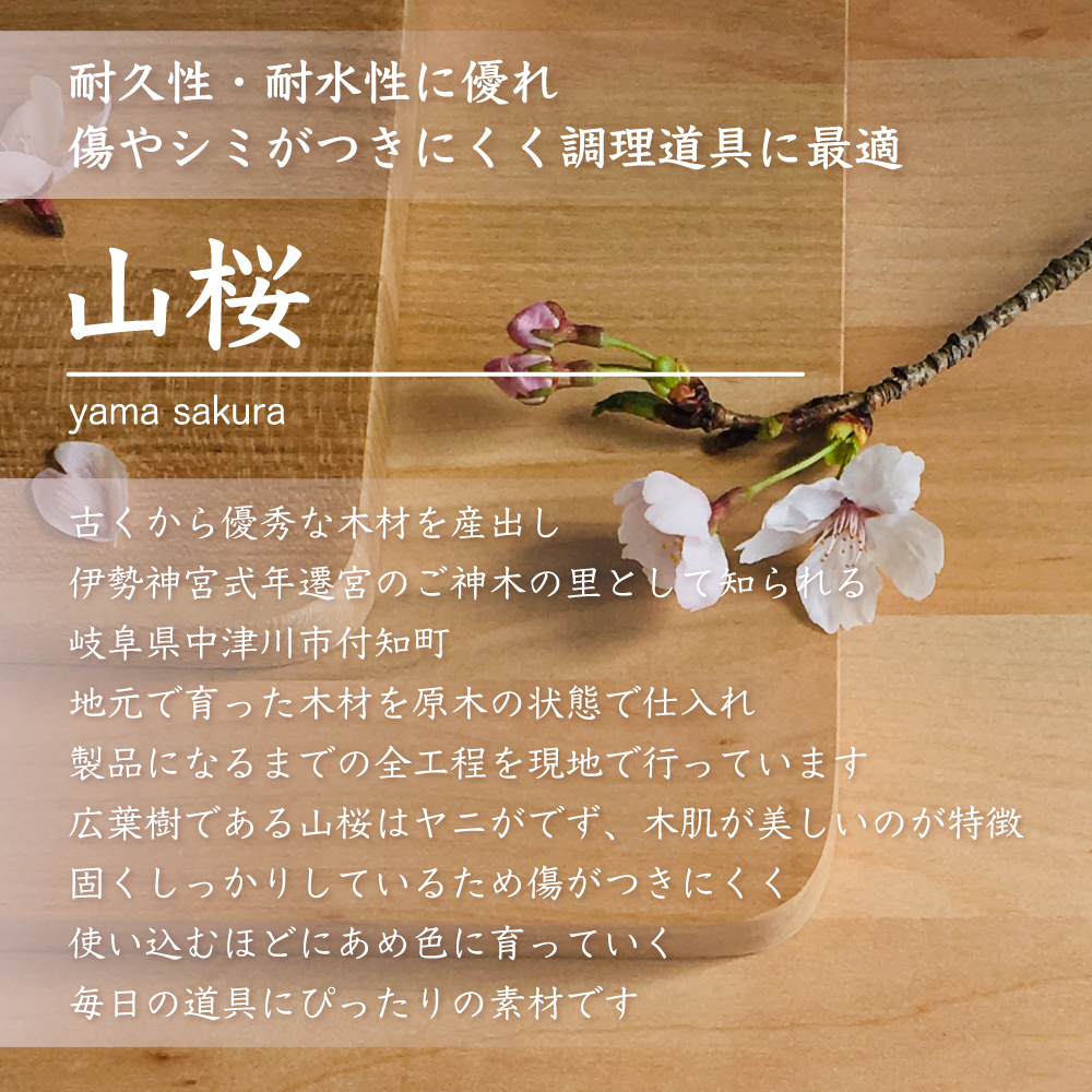 丈夫で優しく美しい木目が特徴の山桜で作られています。
